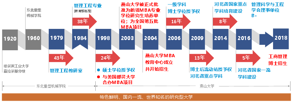 燕大MBA项目全面依托永利皇宫app 办学,永利app 前身为1979年成立的东北重型机械永利app 管理工程教研室,在此基础上1984年管理工程系成立。1985年后管理工程系随学校逐步迁移至秦皇岛办学,1998年正式定名为永利皇宫app 。燕山大学MBA项目起步较早,永利app 早在1998年就与美国都灵大学合办MBA项目;2003年7月,燕山大学被正式批准为新增MBA专业学位研究生培养单位;是全国第五批MBA项目,2004年燕山大学MBA教育中心成立,并开始招生。