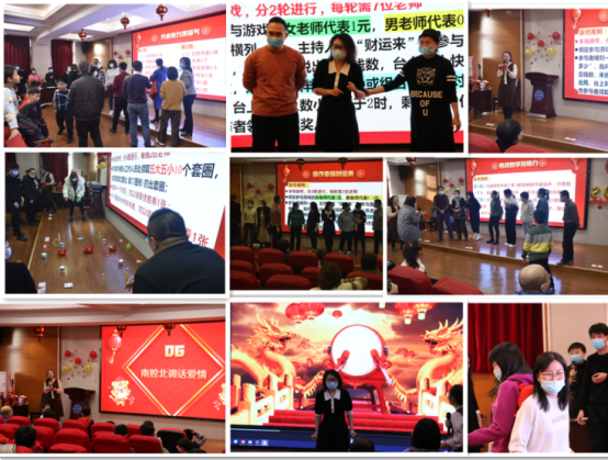 这一年中所取得的骄人成绩,并对即将到来的2022年作出新的展望。随后开始的是欢快愉悦的游戏环节,第一个游戏是“活力圈圈 圈好运”,成功调动了老师们参与活动的积极性,也点燃了老师们的热情。接下来的“合作幸福财运来”、“挑战数字涨脑力”、“南腔北调话爱情”、“虎虎生风奔幸福”、“击鼓传花好运来”以及“齐心聚力集福气”等游戏,把全场的氛围推向一个又一个高潮,欢声笑语洋溢全场,掌声也是此起彼伏。这充分展现了经管人奋发向上的精神风貌,展现了经管大家庭团结友爱的精神。