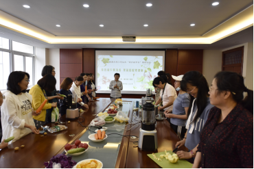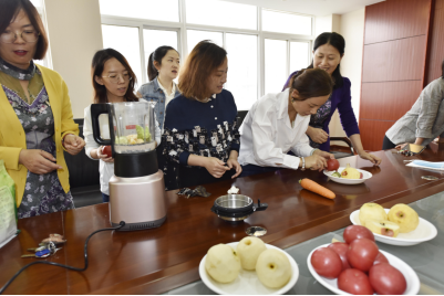 活动第二阶段,老师们开始自己动手制作果蔬汁,各种各样的果蔬食材放满了一桌,大家相互之间热烈交流,根据自己的喜好制作出了一杯杯颜色鲜艳、味道可口的果蔬汁。