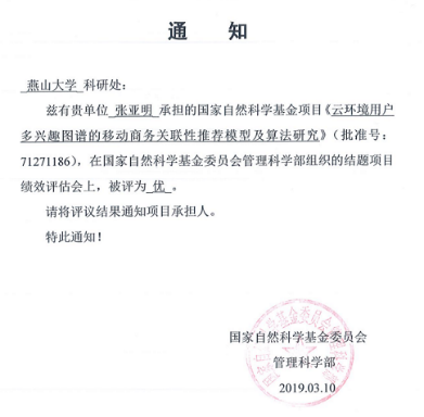 张亚明教授主持的国家自然科学基金面上项目“云环境用户多兴趣图谱的移动商务关联性推荐模型及算法研究”(2013.01-2016.12)针对“数字宇宙”时代传统推荐系统弊病,深入挖掘云环境下移动商务用户多源兴趣的内涵和变迁,剖析云计算下移动商务关联性推荐的作用机理,提出分布式、可扩展、负载均衡的推荐系统模型,形成了全面、系统的云环境用户多兴趣图谱的移动商务关联性推荐研究框架与理论体系。项目发表紧密相关的学术论文60余篇,其中SSCI、SCI、EI期刊15篇,CSSCI期刊22篇,国家自然基金委A类期刊3篇,获省优秀博士论文1篇,省优秀硕士论文1篇。