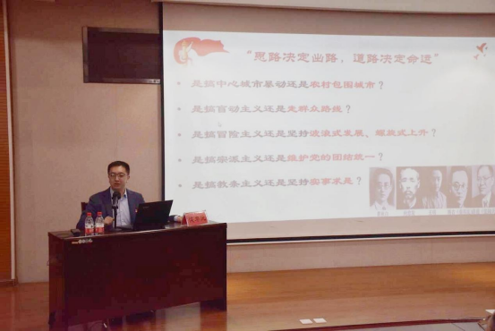 教师侯卓沅在经管楼A218为党员师生代表作主题为“百年恰是风华正茂——共学党史‘必修课’”的党史教育专题讲座。讲座由永利app