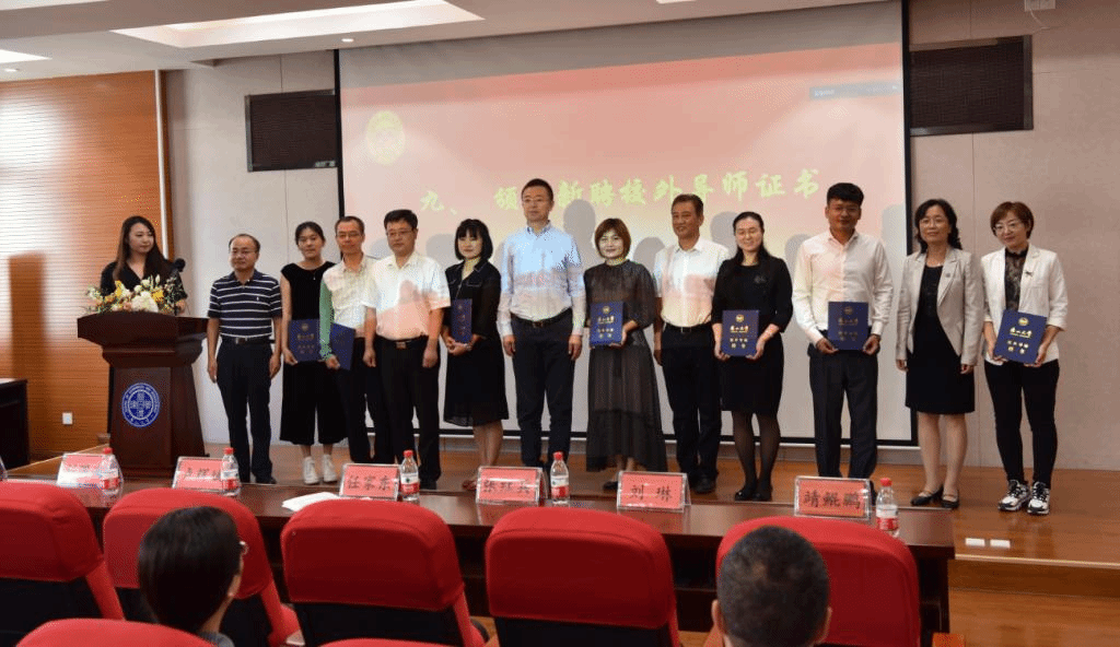 校院领导为燕山大学MBA校外导师代表丁丽娜、刘博明、潘娟娟、刘妍、曲磊、李强、孟祥伟颁发聘书。