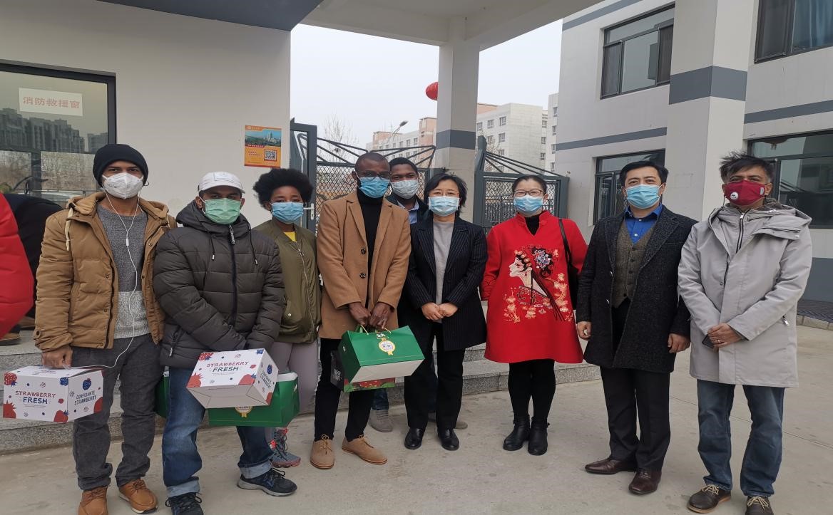 领导老师在与留学生逐一亲切交流后,向留学生生发放了慰问品。
