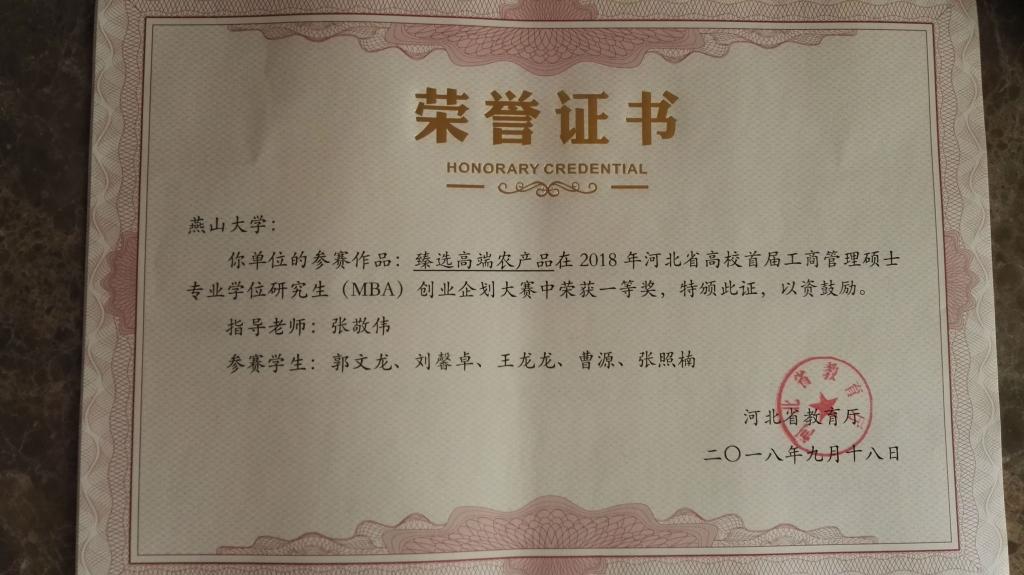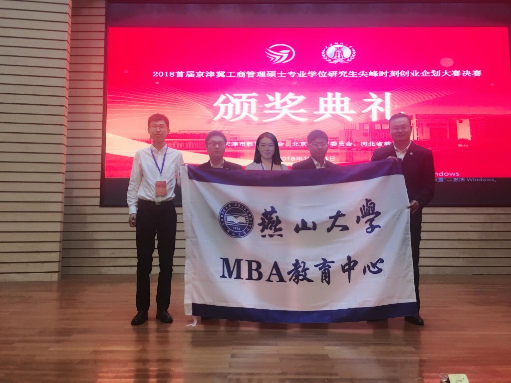 2018年10月14日下午,由天津市教育委员会、北京市教育委员会、河北省教育厅联合主办的首届京津冀MBA专业学位研究生尖峰时刻创业企划大赛圆满闭幕。我校2017级MBA学员郭文龙、刘馨卓、王龙龙、曹源、张照楠等5人的参赛作品《臻选高端农产品》荣获大赛二等奖,我校张敬伟教授荣获最佳指导教师,燕山大学荣获最佳组织奖。