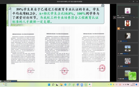 各位老师针对线上线下混合式教学设计的关联性、考核体系的设计、线上学时结合多元化考核安排的合理性、大班授课多元化考核工作量设计的合理性、线上资源与线下教材的对接和提供的线上资源数量的合理性等问题进行了积极的讨论和交流。此次汇报会对线上线下混合式教学在创新教学内容、教学形式、教学手段和多元化考核方面都进行了有益的探索和尝试,对创新本科教学新模式起到了积极的推动作用。