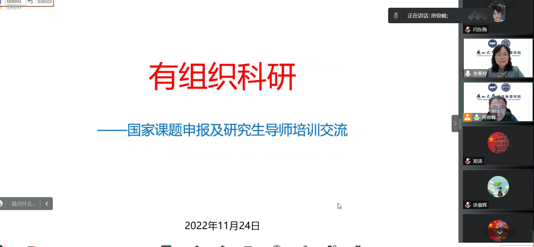 于11月24日下午通过腾讯会议组织召开了国家基金申报工作推进会暨导师培训交流会。李春玲院长、陈晶璞副院长、各系主任、拟申报国家课题的教师、全体研究生导师及科研管理人员共100余人参加会议。会议由李春玲院长主持。