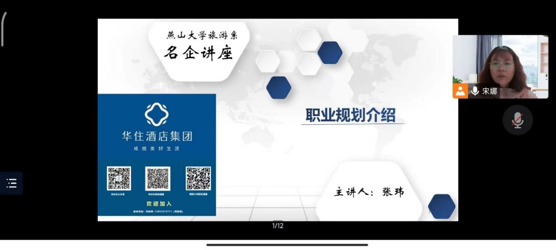 宋娜老师最后做了总结发言,首先感谢华住酒店集团在校企合作中对燕山大学旅游管理专业的支持和帮助,同时预祝同学们在未来的职业生涯发展中能够结合能力与兴趣,精准定位,尽快适应社会,找到适合自己的职业发展路径。