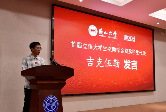 2019级会计专业吉克伍勒作为获奖学生代表发言。吉克伍勒表达了对郭健师兄关心关爱,立信会计师事务所急公好义,学校、永利app
