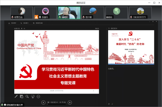 靖鲲鹏副院长为工商管理系党支部的党员老师带来了一场精彩的党课。党课的主题是:深入学习二十大,做新时代“四有”好老师。支部的17位老师通过腾讯会议的形式参加了党课的学习。