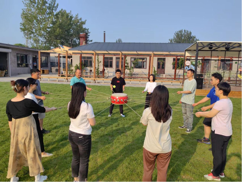 “同心鼓击球”游戏考验老师们的团队合作能力。教练下达的任务是一次挑战完成50次击球。起初,老师们击球数连5个都达不到!大家在实战中摸索着开球高度、绳子收紧放松的时间节点,如何一致行动掌握方向。渐渐地大家配合越来越默契,6个、13个、25个、33个不断刷新着记录,最终,功夫不负有心人,老师们实现了一次连续击球66个,顺利完成了挑战。