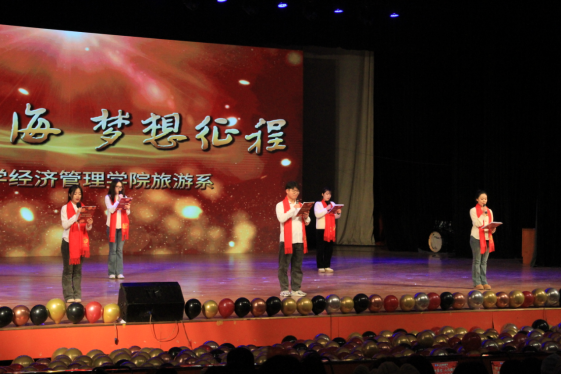 取得了优异成绩,希望大家勇于面对挑战,追求卓越,期待旅游系师生未来能够取得更加辉煌的成就。本篇章的文艺节目包括体现“传承”“融合”“感恩”的《新青年》《东方韵·西方舞》《满腹经纶》和旅游系本科生、硕士生、博士生和毕业生代表共同朗诵的《蜕变》。