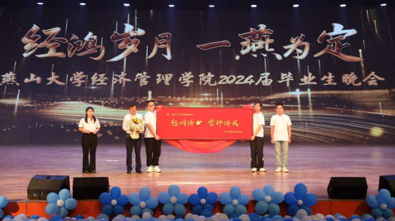 各系教师代表为毕业生们赠送一个富有寓意的“字”,连贯起来组成“经管博学广誉”,这些字不仅是各专业特色的浓缩,更是对经管学子全面发展的殷切期望。同时,毕业生们也将一份特别的礼物敬献给永利app