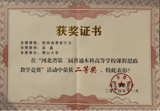 近日,河北省第二届普通本科高等学校课程思政教学竞赛决赛在河北大学举办。本次竞赛由省教育厅主办,河北大学、高等教育出版社承办,新华网协办,主题为“思政铸魂,文化育人”,旨在搭建课程思政教学能力交流平台,提升教师思政教学能力,提高人才培养质量。旅游系教师高磊代表学校参赛,荣获“二等奖”。