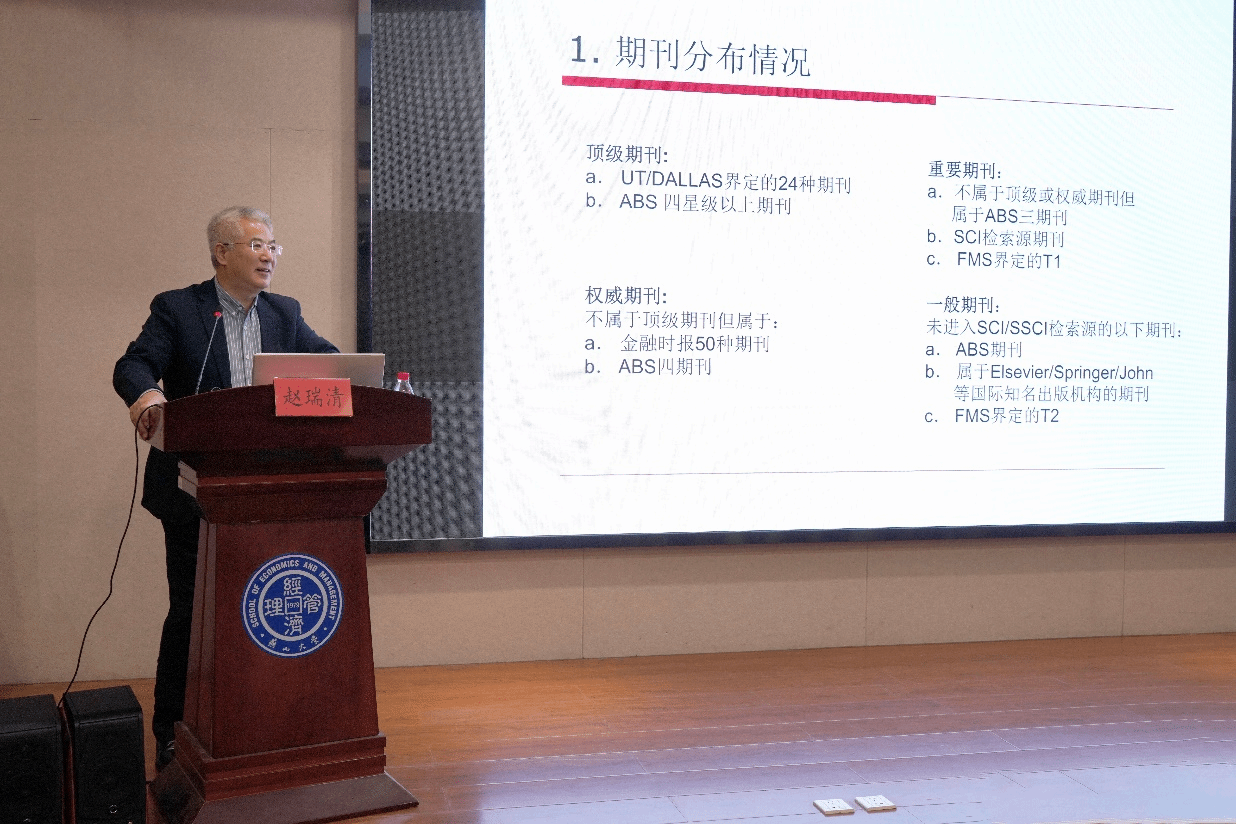 联合举办。特别邀请《系统工程学报》常务副主编、天津大学管理与经济学部赵瑞清教授作题为《如何撰写高水平科技论文》的学术报告。赵瑞清教授首先阐明了高水平科技论文写作的重要性,并结合自己担任《系统工程学报》常务副主编、《Journal of Uncertain Systems》领域主编的经验,重点介绍了如何发现有价值的研究问题和确定研究方向,如何撰写高水平的题目、摘要、引言、文献综述、正文、分析、结论等内容,如何有效提升学生科技论文撰写能力,以及青年教师如何指导学生开展高水平科技论文写作。赵教授在每一部分讲解中均结合多年积累的经典案例予以具体说明,循循善诱,层层递进;在“如何指导学生开展高水平科技论文写作”部分,还分享了自己指导学生的具体做法和心得体会。最后赵教授鼓励在场的青年教师和研究生在科研的道路上要不断开拓进取,勇往直前。
