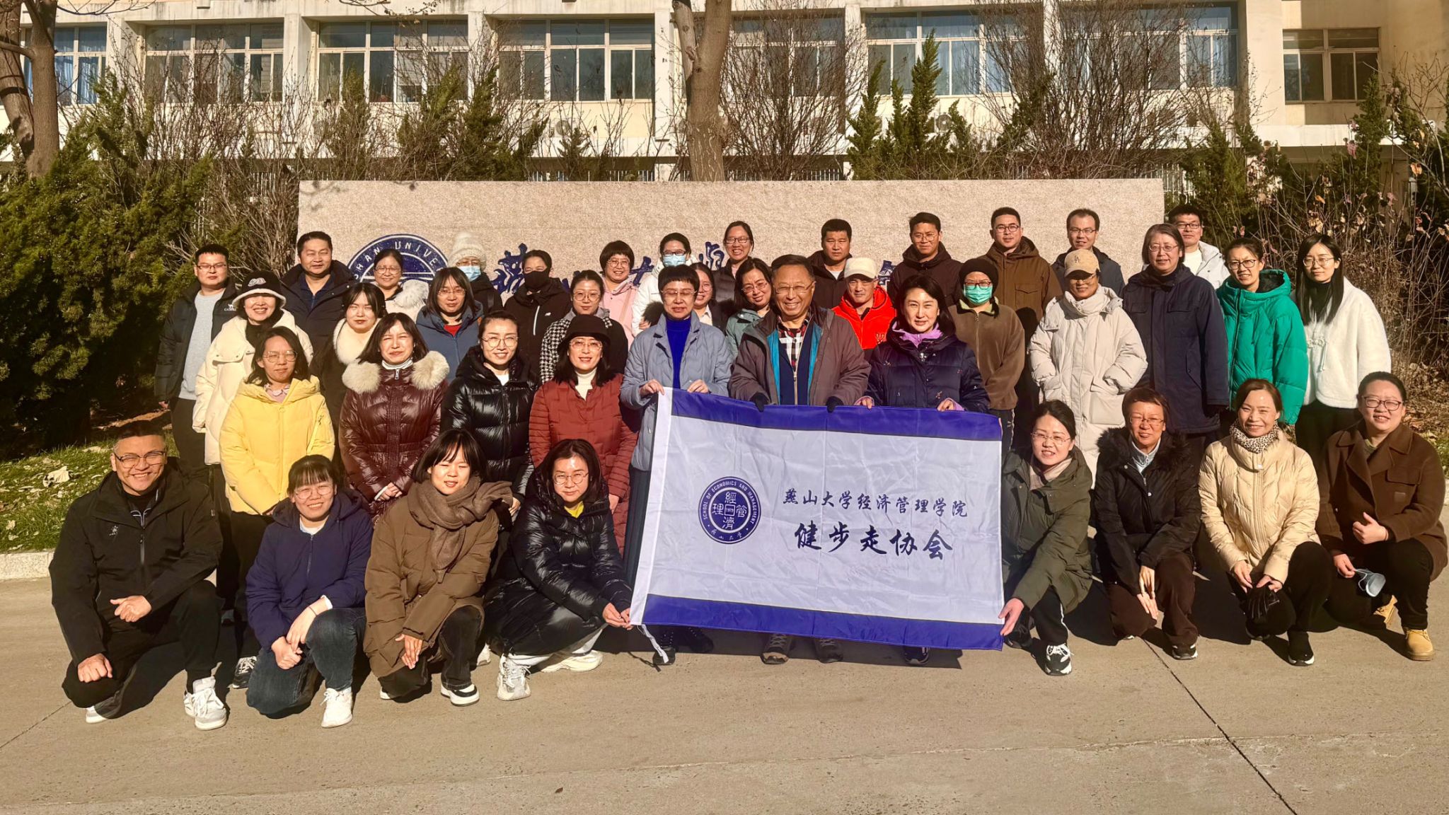 座谈结束后,全体教师在经管楼前合影,随后开始纪念“一二·九”运动校园主题健步走活动。教师们从经管楼A区门前出发,在分工会委员的引导下,途经景行路、新图书馆、里仁前主路、燕园餐厅、继续教育永利app