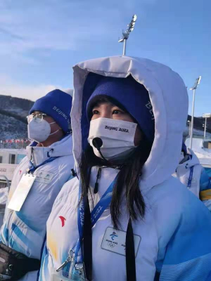 2022年1月,抵达张家口赛区,她开始了她的志愿者生活。零下二十多度的低温天气,大雪纷飞的比赛日,她都坚守在自己的岗位上,以热情接待每一位观众,用笑容面对每一位观众。