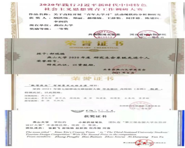 她无论是在生活和学业上都有着不俗的成绩。在科研学习上,曾参与省部级课题——教育部人文社会科学研究规划基金项目“高铁条件下京津冀区域旅游效率分析及协同提升路径研究”,本科期间,发表一篇普刊文章(一作);研二期间,发表一篇中文核心期刊(1B)。竞赛方面也荣获多项奖状:2020-2021年硕士研究生国家奖学金、第三届全国大学生旅游设计大赛二等奖、全国大学生金融精英挑战赛优秀奖、燕山大学“志愿杯”演讲比赛三等奖、河北省冀青工作调研大赛一等奖、河北省“调研河北”大赛一等奖、全国移动互联网创新大赛华北赛区铜奖、燕山大学“食光正好,拒绝盛宴”图片类作品二等奖、燕山大学第二届“我和我的祖国”主题文化活动“最佳作品奖”、第七届河北省“互联网+”大学生创新创业大赛金奖。