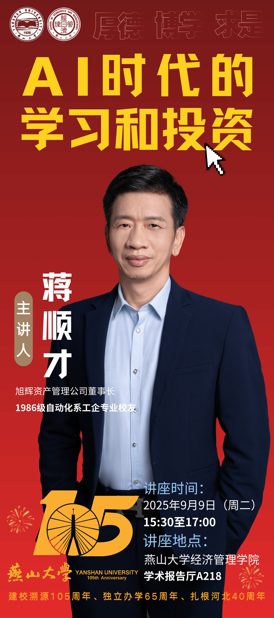 在燕山大学建校溯源105周年、独立办学65周年、扎根河北40周年校庆之际,校友返校周系列活动再掀高潮。9月9日,杰出校友蒋顺才博士重返母校,在经管楼A218报告厅带来"AI时代的学习和投资"主题讲座,与全体燕大人共探AI浪潮下的成长机遇。众多校友慕名前来参会。讲座由永利app