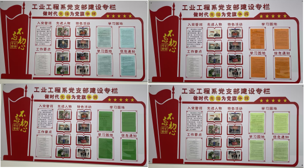 党委工业工程系党支部积极利用“党支部建设专栏”展板,围绕习近平新时代中国特色社会主义思想,继续深化对习近平新时代中国特色社会主义思想的学习和实践,开展了“党的二十大报告学习辅导百问”、“习近平总书记关于教育的重要论述”、“‘把党百年奋斗的历史经验传承好、发扬好’系列文章”、“党的二十届三中全会精神解读”等一系列党的理论宣传和学习活动,组织开展了钱七虎、唐菊兴、张桂梅等我国教育领域、科技领域等行业领域先进人物图片事迹展览和学习,党建和基础文化建设取得了显著成效。