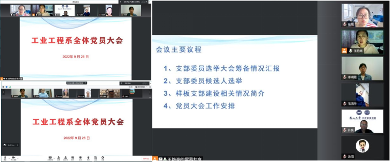 工业工程系党支部2022年9月党员人数已增加至10人,按照《中国共产党章程》、《中国共产党基层组织选举工作条例》等工作条例规定,为了推动工业工程系校级样板支部建设,考虑未来支部工作需要,支部拟补充支部委员会委员等相关工作力量。因此,工业工程系全体党员在院党委的指导下,于2022年9月28日晚召开线上党员大会预备会议,讨论支部委员会成员选举、向院党委请示党员大会等工作内容。