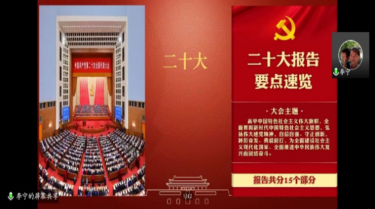 首先李宁老师向支部成员详细介绍二十大报告的主要内容,以及开展二十大的重要意义。希望全体党支部成员能够坚定不移听党话、跟党走,做有理想、肯奋斗的新时代好青年。李老师希望党支部成员能够深入学习二十大报告内容,感悟中国在新时代砥砺前行的伟大奋斗精神。