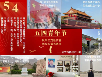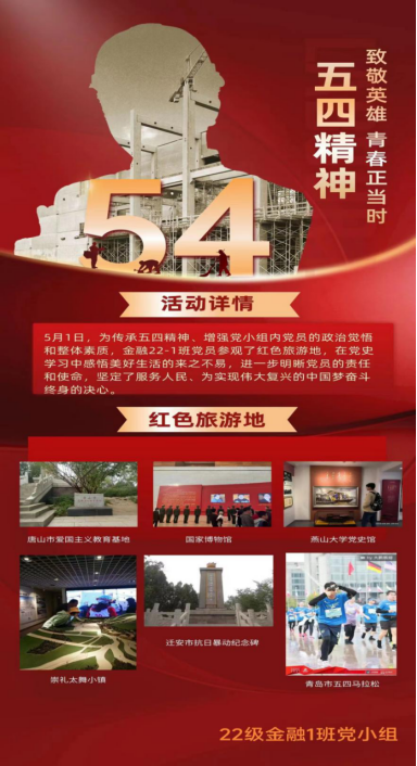 传承五四精神,致敬革命英雄。金融22-1班党小组为传承五四精神、增强党小组内党员的政治觉悟和整体素质,组织参观了红色旅游地,在党史学习教育中感悟美好生活的来之不易,进一步明晰党员的责任和使命,坚定了服务人民、为实现伟大复兴的中国梦奋斗终身的决心。