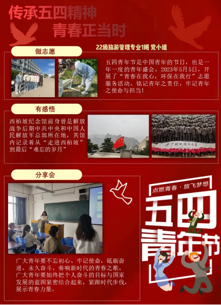 点燃青春,放飞梦想。旅游管理22-1班党小组5月份陆续开展了“青春在我心,环保在我行”志愿服务活动,铭记青年责任,牢记青年使命与担当;参观西柏坡纪念馆,回顾那段“难忘的峥嵘岁月”;开展理论学习分享会,不忘初心,牢记使命,唱响新时代的青春之歌!