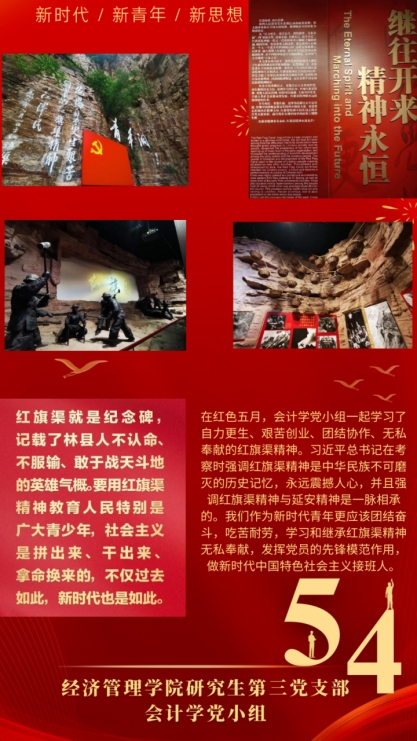 红色五月,弘扬红旗渠精神。会计学22-1班党小组学习了自力更生、艰苦创业、团结协作、无私奉献的红旗渠精神。作为新时代青年,我们更应该团结奋斗,吃苦耐劳,弘扬红旗渠精神,发挥党员的先锋模范作用,做新时代中国特色社会主义接班人。
