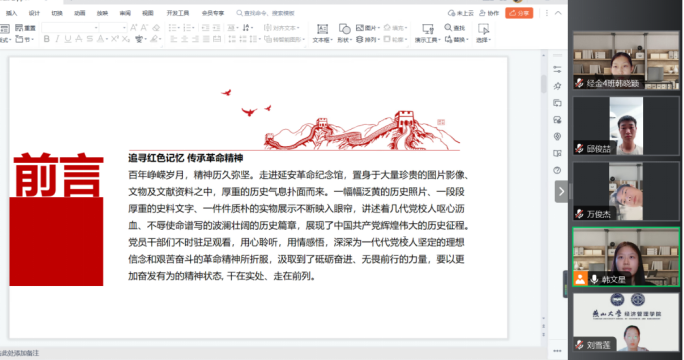 此次展示会的主题为《走进延安革命纪念馆》,由党员韩文星同学主持会议。展示会共分为“延安革命纪念馆介绍”、延安精神“、“游览感想”三个部分。在第一部分中,韩文星同学为我们介绍了位于延河畔的浓缩了13年红色风云的延安革命纪念馆,在生动的介绍下,一幅幅泛黄的历史照片、一段段厚重的史料文字、一件件质朴的实物仿佛出现在党员们面前。在第二部分中,韩文星同学为党员们介绍延安精神,延安精神是党在延安十三年凝结的宝贵精神财富,是伟大建党精神在延安时期的精神赓续,也是中国共产党人精神谱系的光辉篇章。在第三部分中,韩文星同学对游览感想进行总结:游览延安革命纪念馆时,我们了解到延安是中国革命的圣地,也是中国革命文化的重要源泉。这里保存着大量珍贵的历史资料和文物,使我们对中国革命历史和文化有了更加深入的了解。此外,在红军长征纪念馆里,展馆运用声光电等现代科技手段,增强陈列的动态效果,使人身临其境,我们看到了衣衫褴褛的红军跋山涉水历经千辛万苦到达陕北,党中央和毛泽东同志入驻延安,从此荒无人烟的陕北高原成为中国革命的摇篮,成为亿万优秀青年魂牵梦萦的圣地。展厅里的每个物件都在叙述红军壮丽的事迹和无畏的精神,我们感受到了中国革命的艰辛和无私奉献的精神,进一步了解了中国革命走向伟大胜利的历史进程。延安创造一个又一个的奇迹,创造了中国革命的奇迹,谱写了中华民族全新的历史!我们相信,在今后的旅行中,我们还会继续前往更多红色景点,去感知更多的历史和文化的魅力,去加深我们对中国的历史和文化有了更深层次的理解和认同。