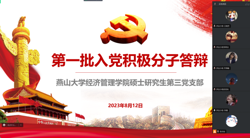 硕士研究生第三党支部于8月12日14:00—17:00于线上腾讯会议开展了入党积极分子答辩会。支部的38名入党积极分子参加此次答辩,4名支委及各党小组推荐的共10名党员同志担任答辩会评委。