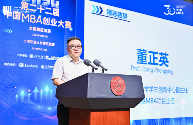 董正英教授在第二十二届中国MBA创业大赛全国赛复赛上发表致辞,并代表主办方对参赛者表示欢迎。董教授指出,创新创业人才培养是未来的全球趋势,是各国发展的潜在核心竞争力,全球著名的大学都非常注重创新创业教育、实践与孵化。“新质生产力”的核心要素就是科技创新,通过科技创新的交叉融合突破所产生的根本性成果,这也给了以科技创新应用为主导的MBA创业项目更多的发展机遇。董教授希望,所有的参赛者都能展现创业激情与勇气,挖掘内在动力。