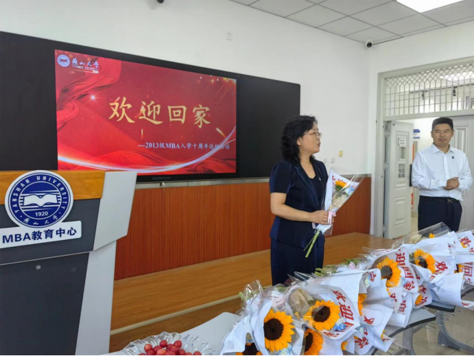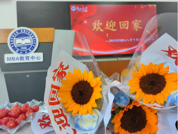院长李春玲、工商管理系主任王玖河、燕山大学MBA教育中心谢玉梅特地为归来的学子们准备了印有“欢迎回家”字样的鲜花、燕大版的月饼和各色水果,款待大家。